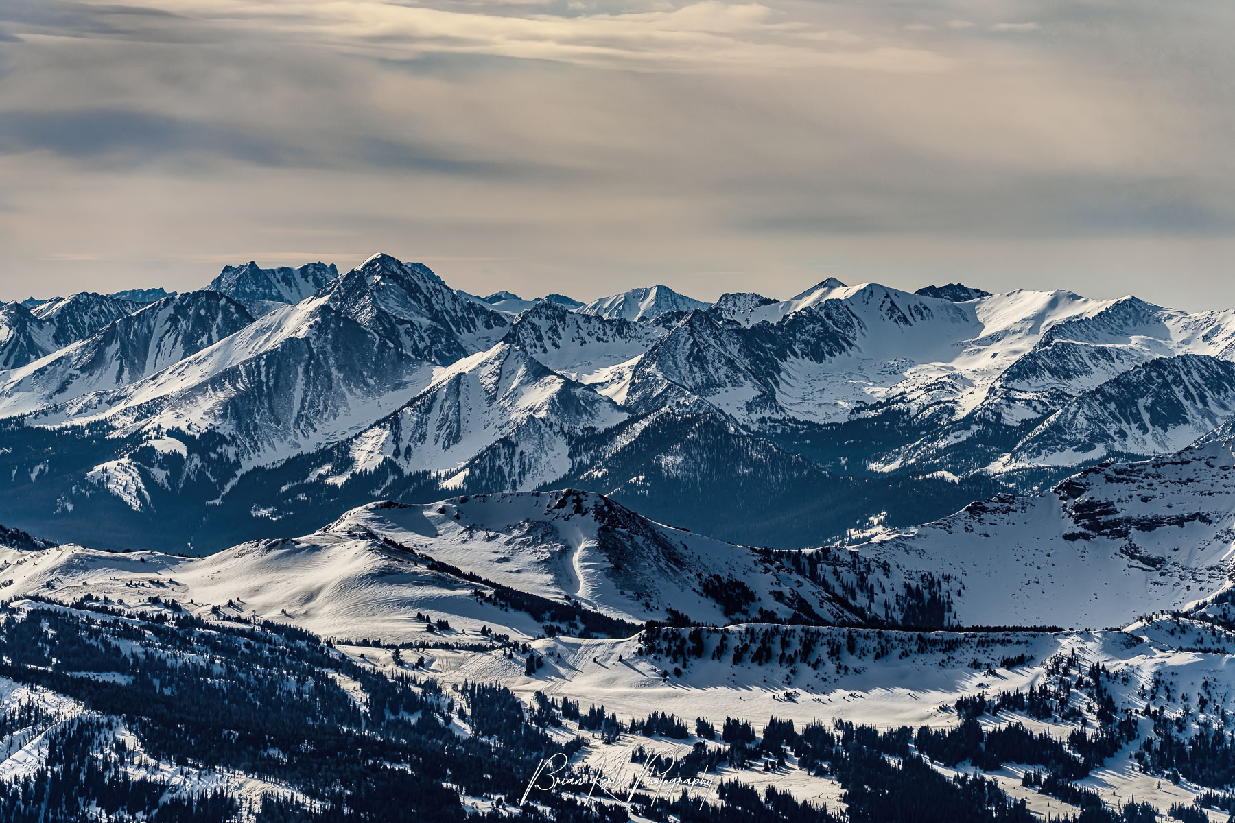 From the 11,166′ summit of Big Sky’s Lone Peak, the view just keeps going, stretching out in a sea of rugged mountain peaks until the horizon runs out of room. Looking south from the summit the snow-draped ancient peaks and ridgelines of the Taylor-Hilgards and the Madison Range fill the scene under a moody, cloud-streaked, winter morning sky.