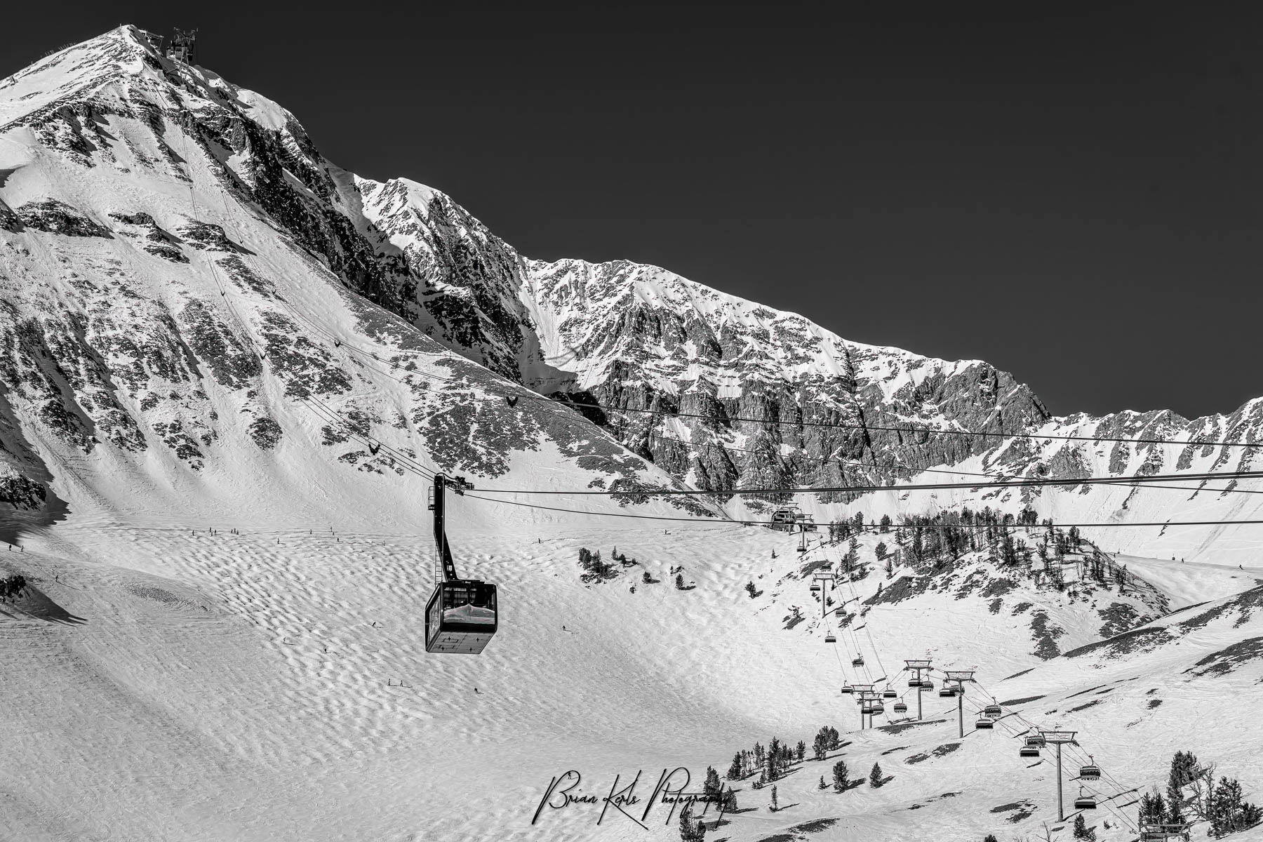 The tram at Big Sky captured in mid-ascent, suspended between the sheer rock face of Lone Peak towering above it and the snow-covered ski slopes below. Shot in black and white, it has a timeless quality — just the tram, the mountain, and the particular joy of a clear winter day at altitude. For anyone who has stood at that lower terminal, loaded in, and felt the slight sway as the mountain begins to fall away and the anxious anticipation of the summit above — this print will take you straight back. Every single time.